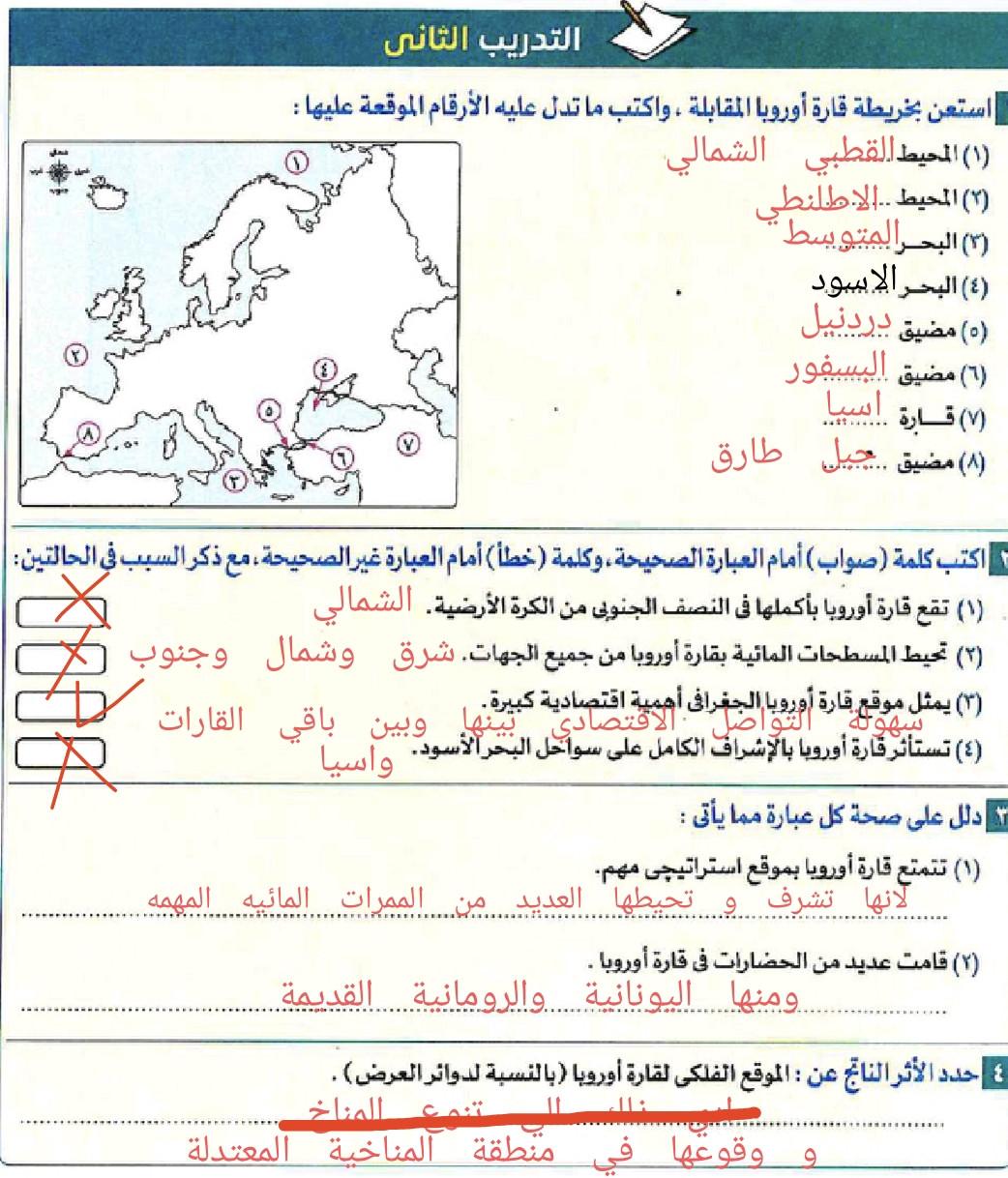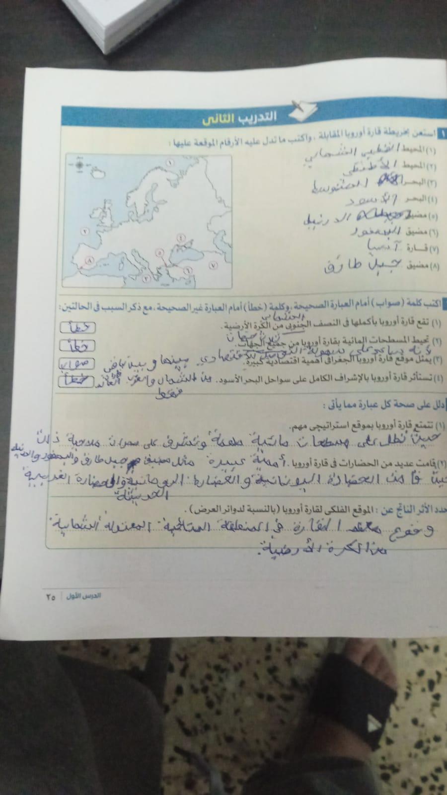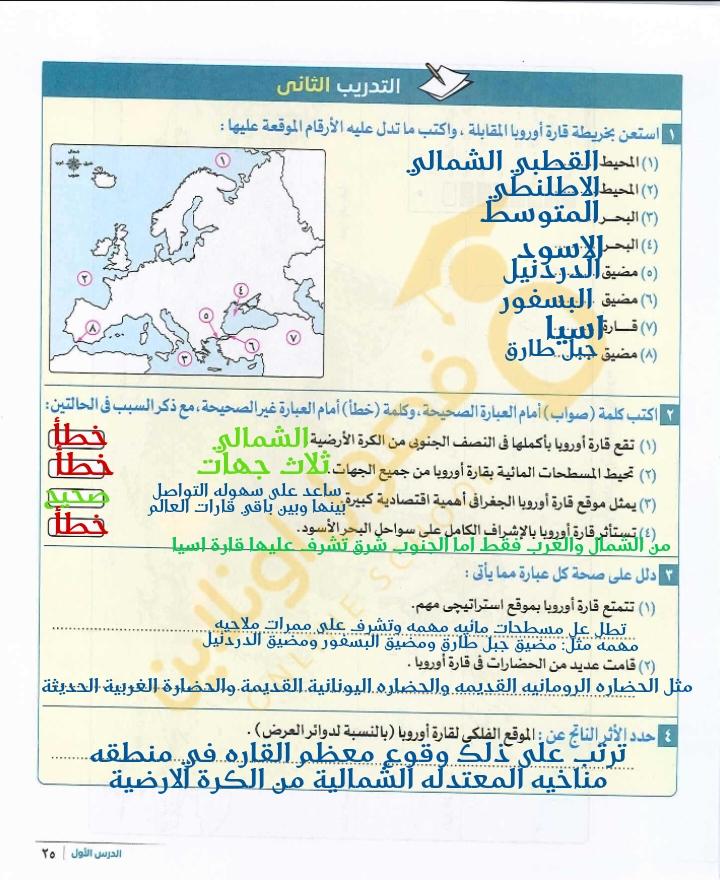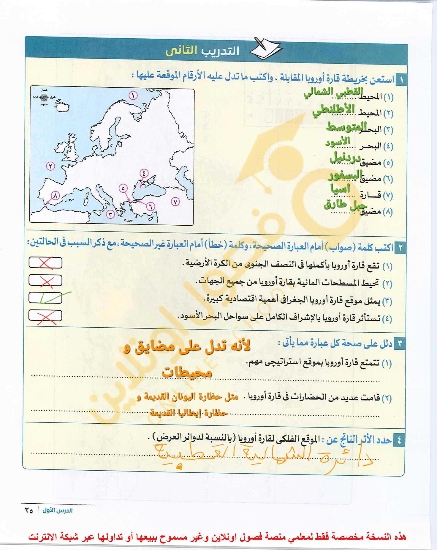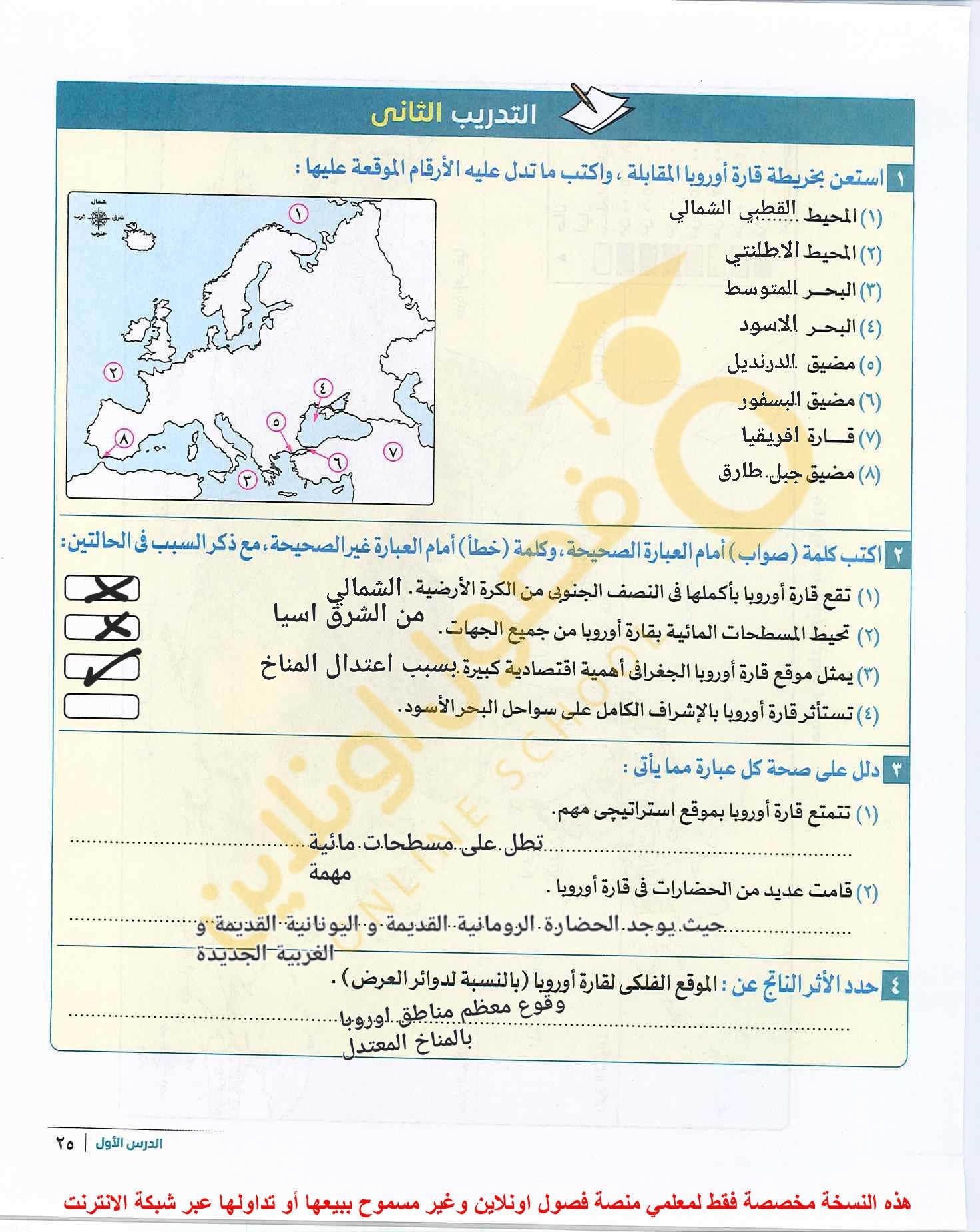 اخدنا اليوم الاهميات لقاره اسيا واوربا والموقع الجغرافي والفلكي لقاره اوربا والواجب باقي التدلريب الاول والتدريب التاني ص 25