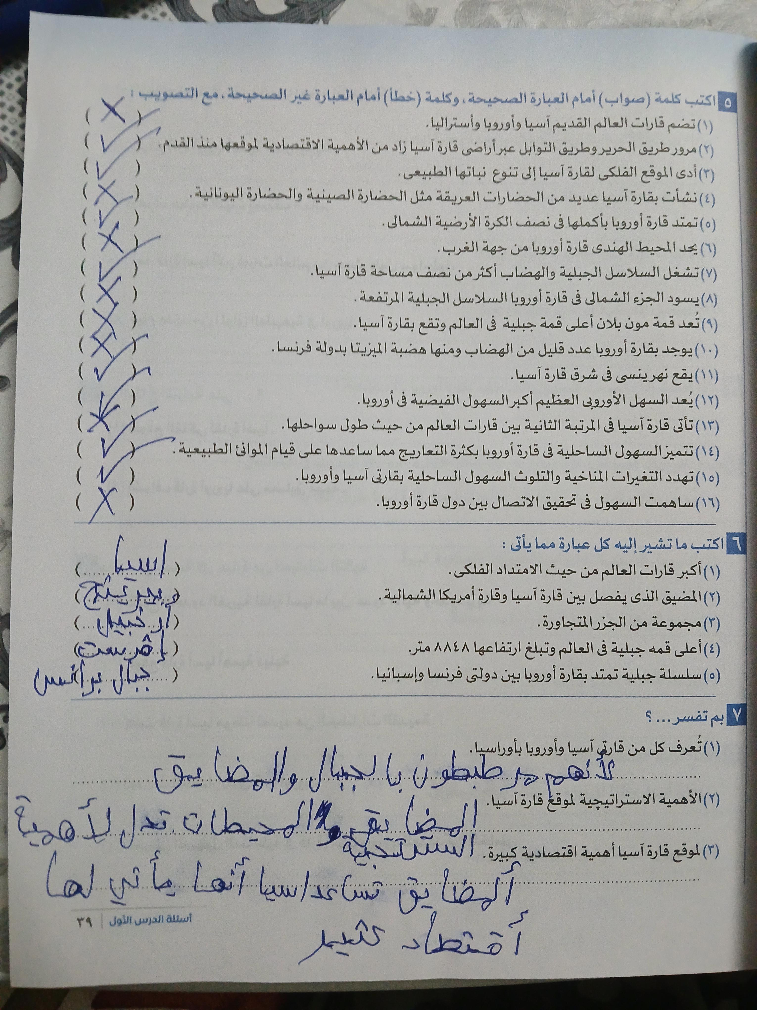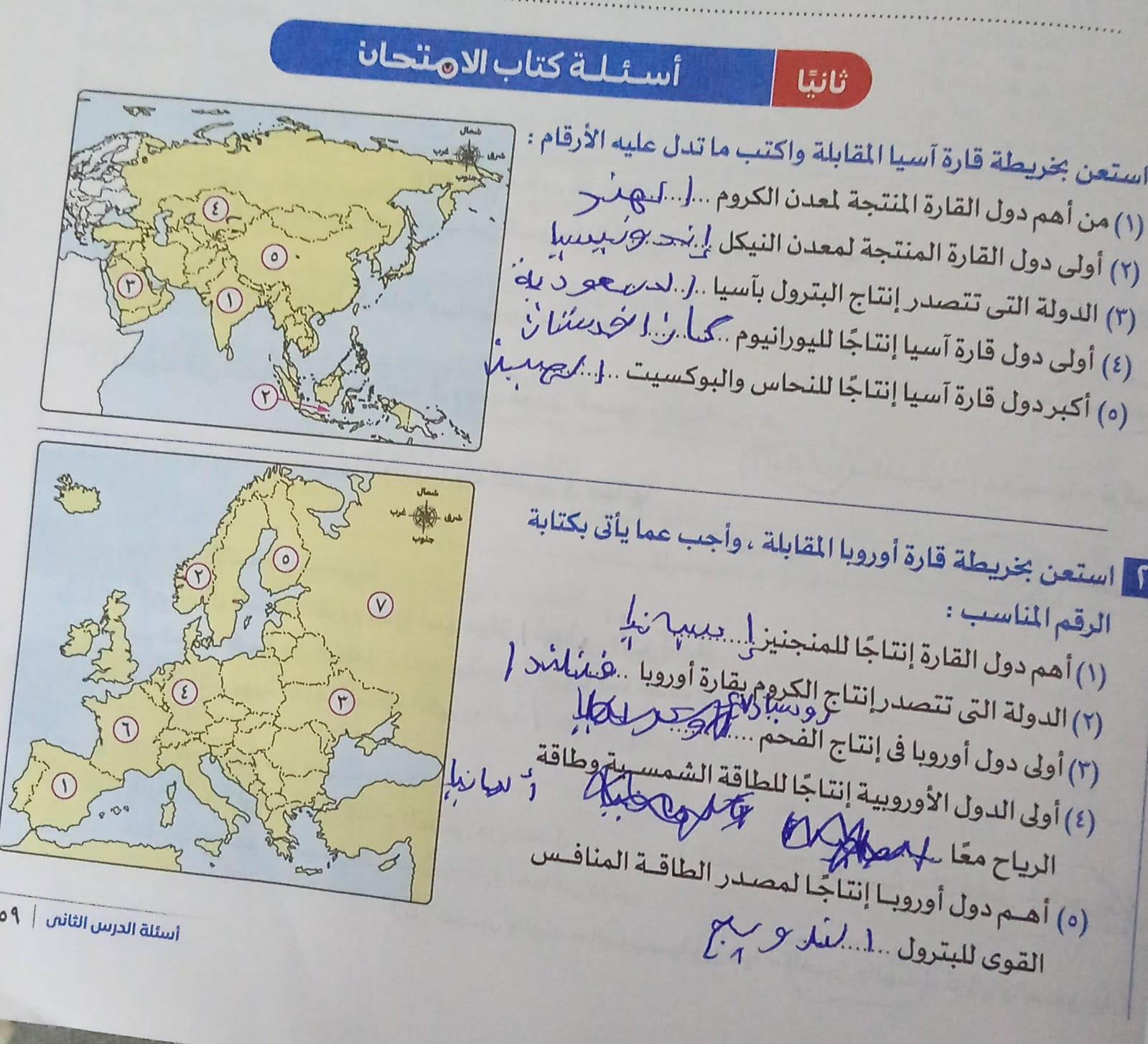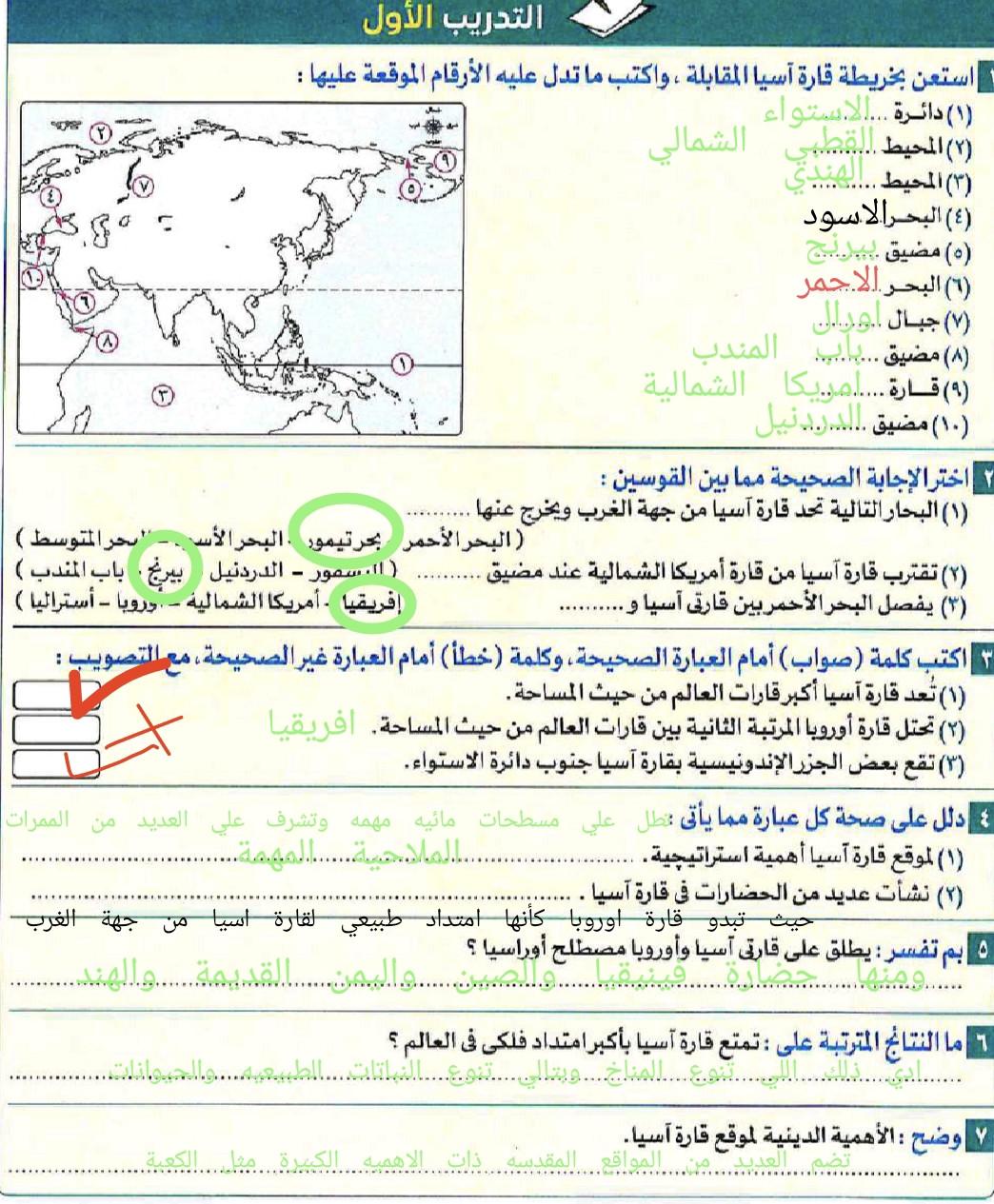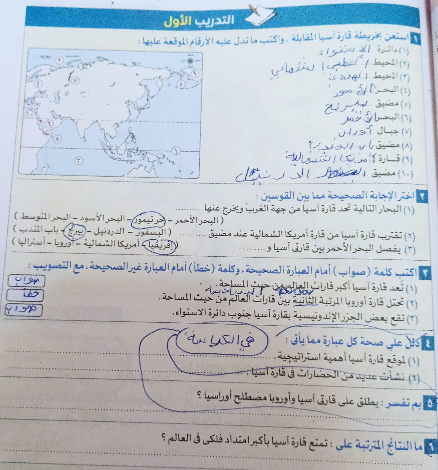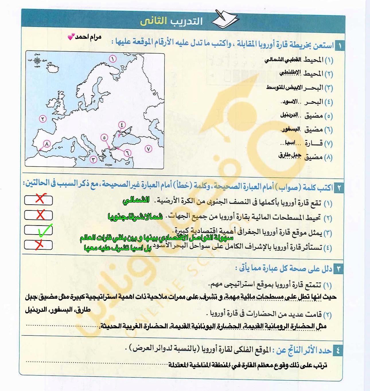 اخدنا اليوم الاهميات لقاره اسيا واوربا والموقع الجغرافي والفلكي لقاره اوربا والواجب باقي التدلريب الاول والتدريب التاني ص 25