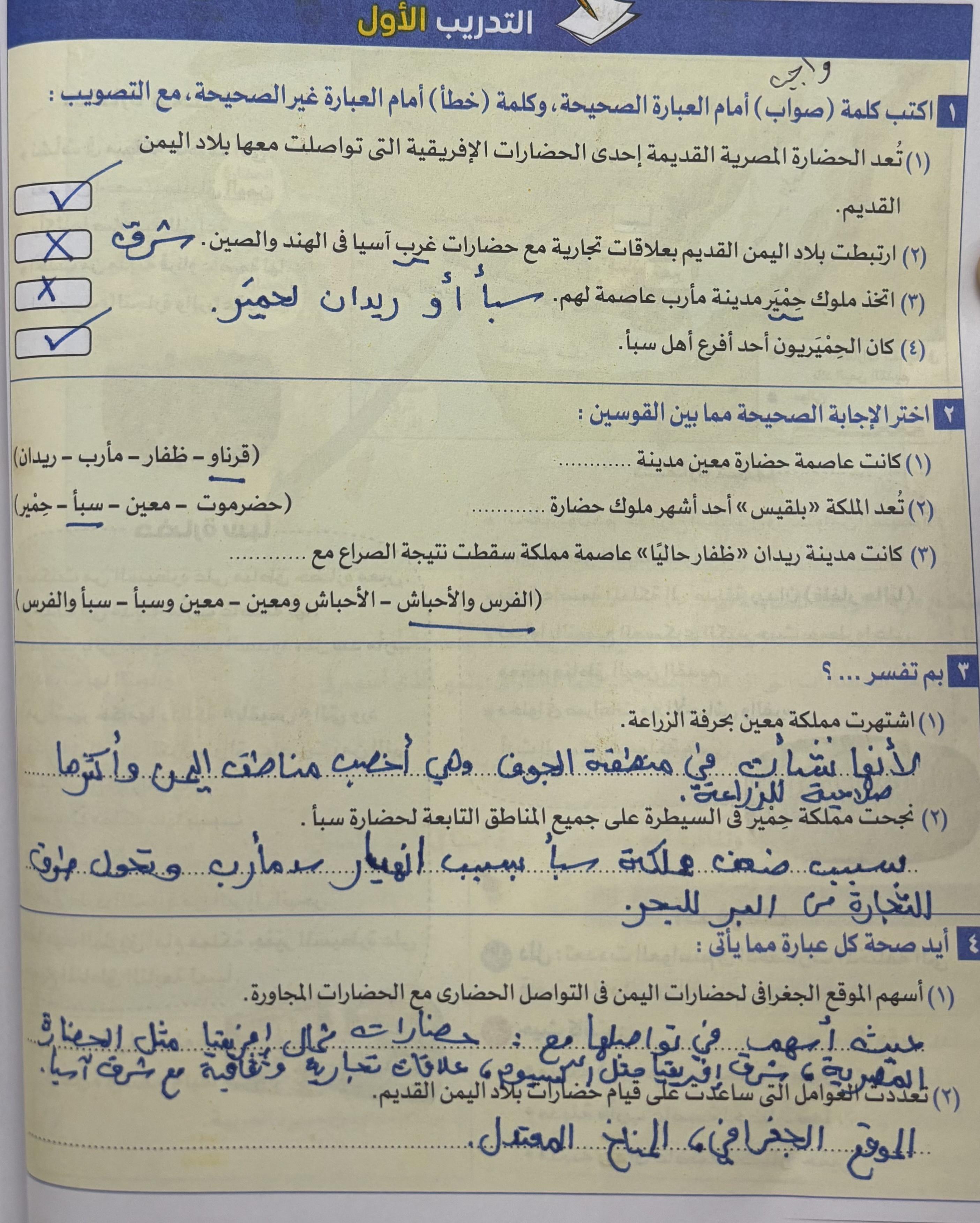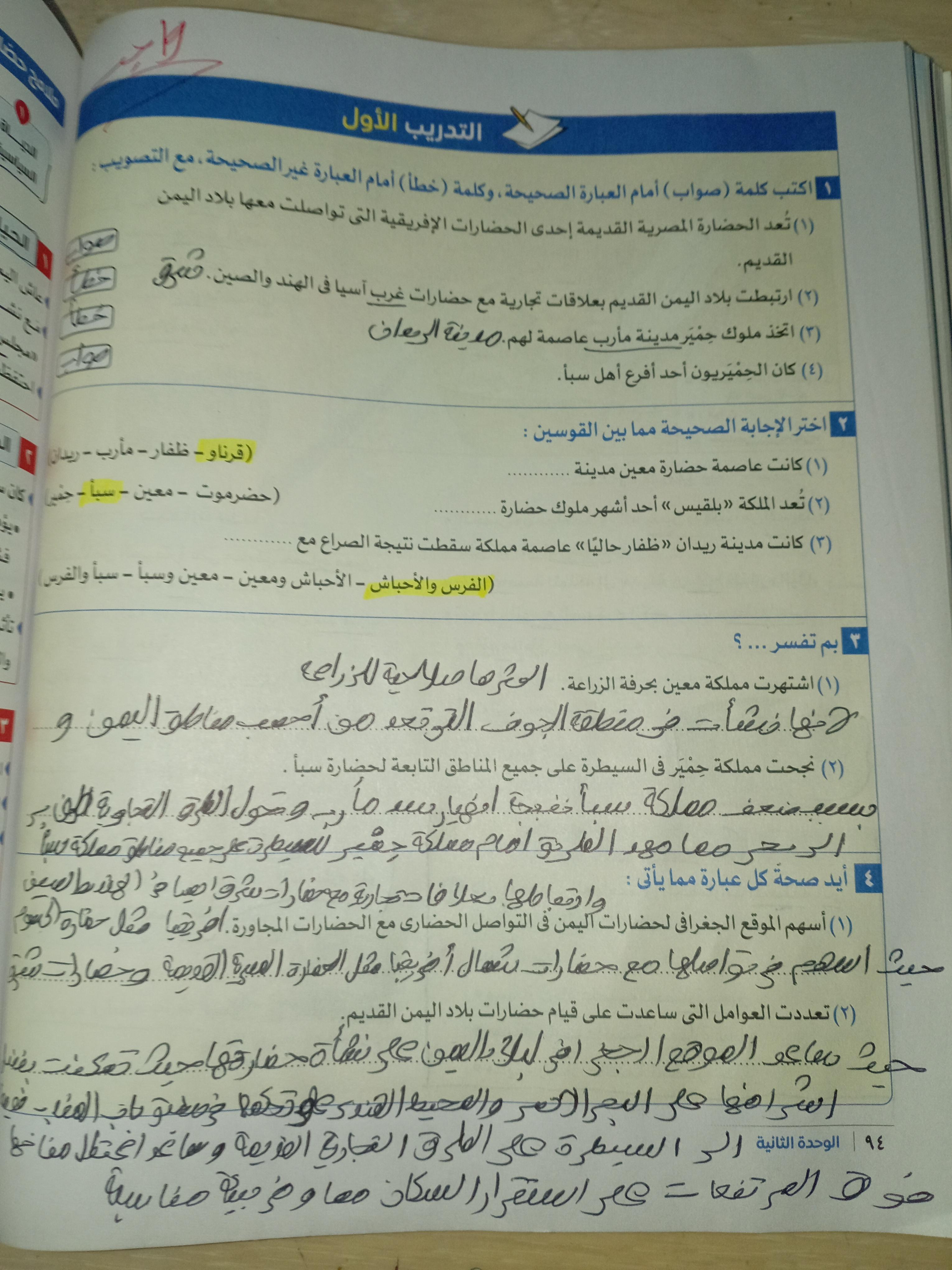 اخدنا اليوم حضارات بلاد اليمن ووقفنا عند الحياه الفكريه والثقافيه والواجب تدريب 1 ص 94 وهنرجع للدرس الاول وناخد واجب ص 84 و85 و86