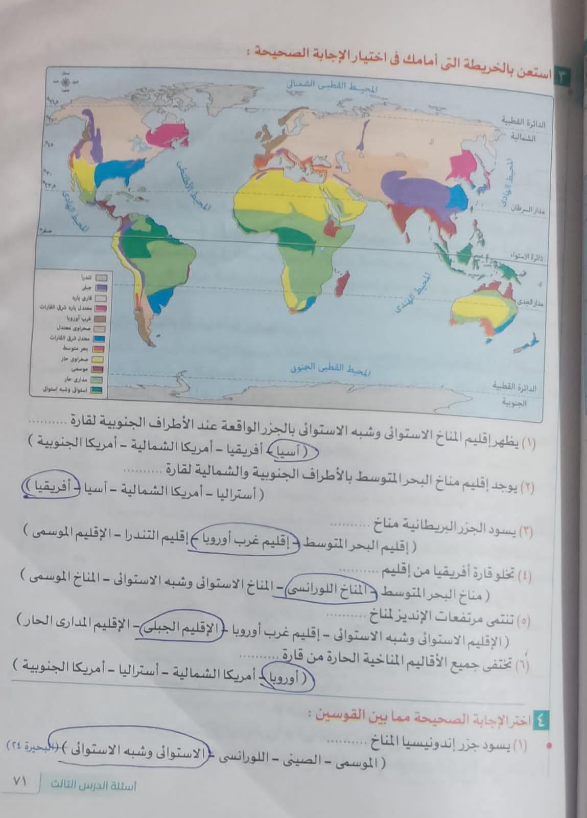 اخدنا اليوم الجزء الاول من الدرس التالت المناخ والنبات الطبيعي في العالم والواجب التدريب الاول ص 65 ف الكتاب الجديد و61 القديم