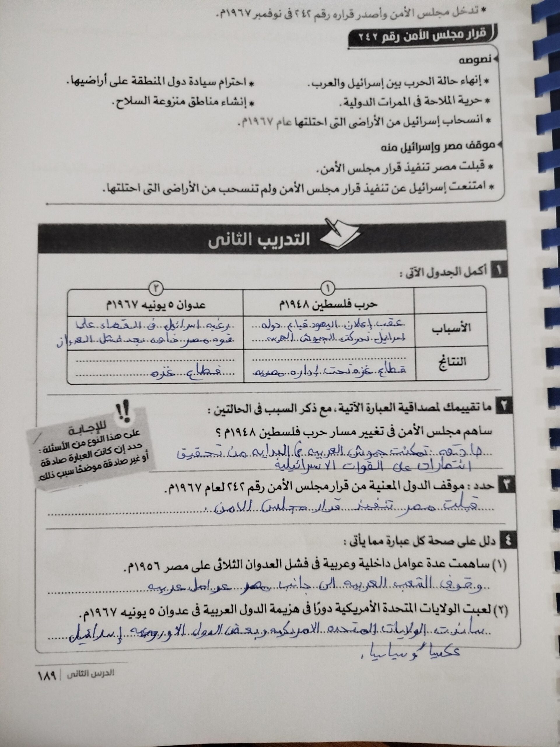 اخدنا الجزء الاول من مصر والقضيه الفلسطينيه ووقفنا عن حرب فلسطين والواجب تدريب 1 ص 185