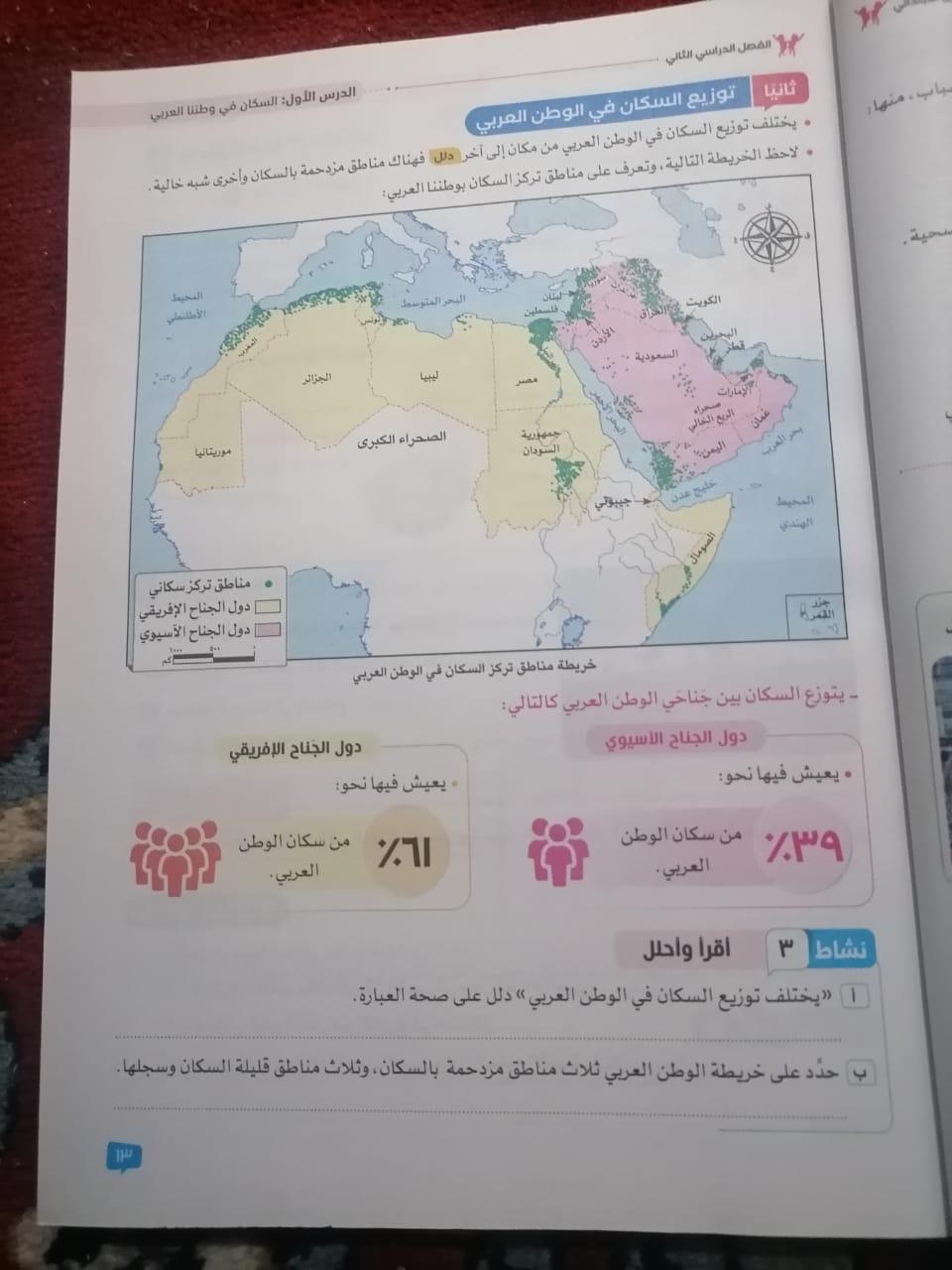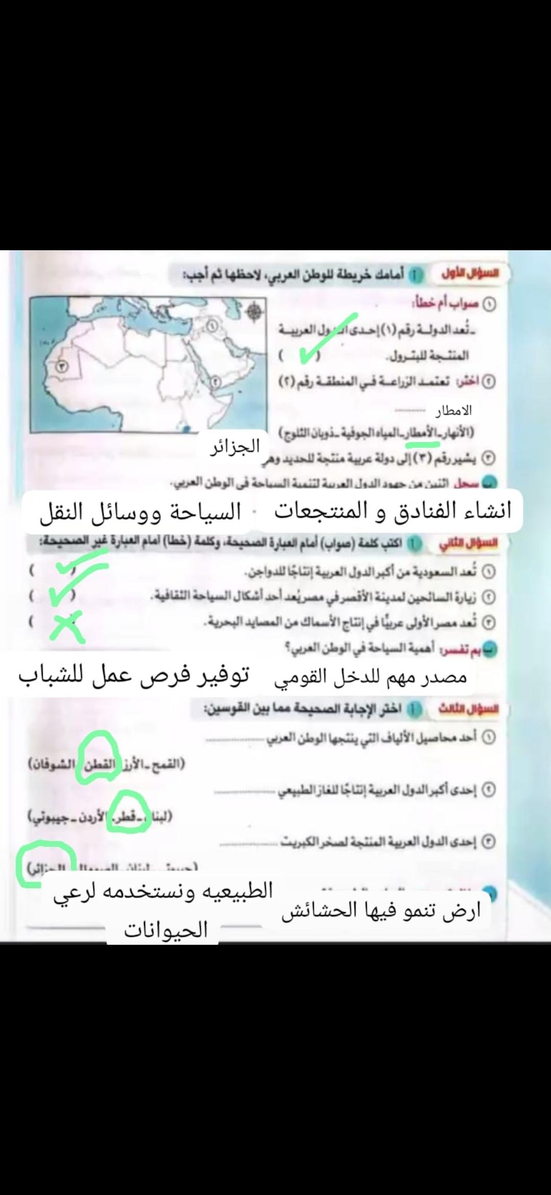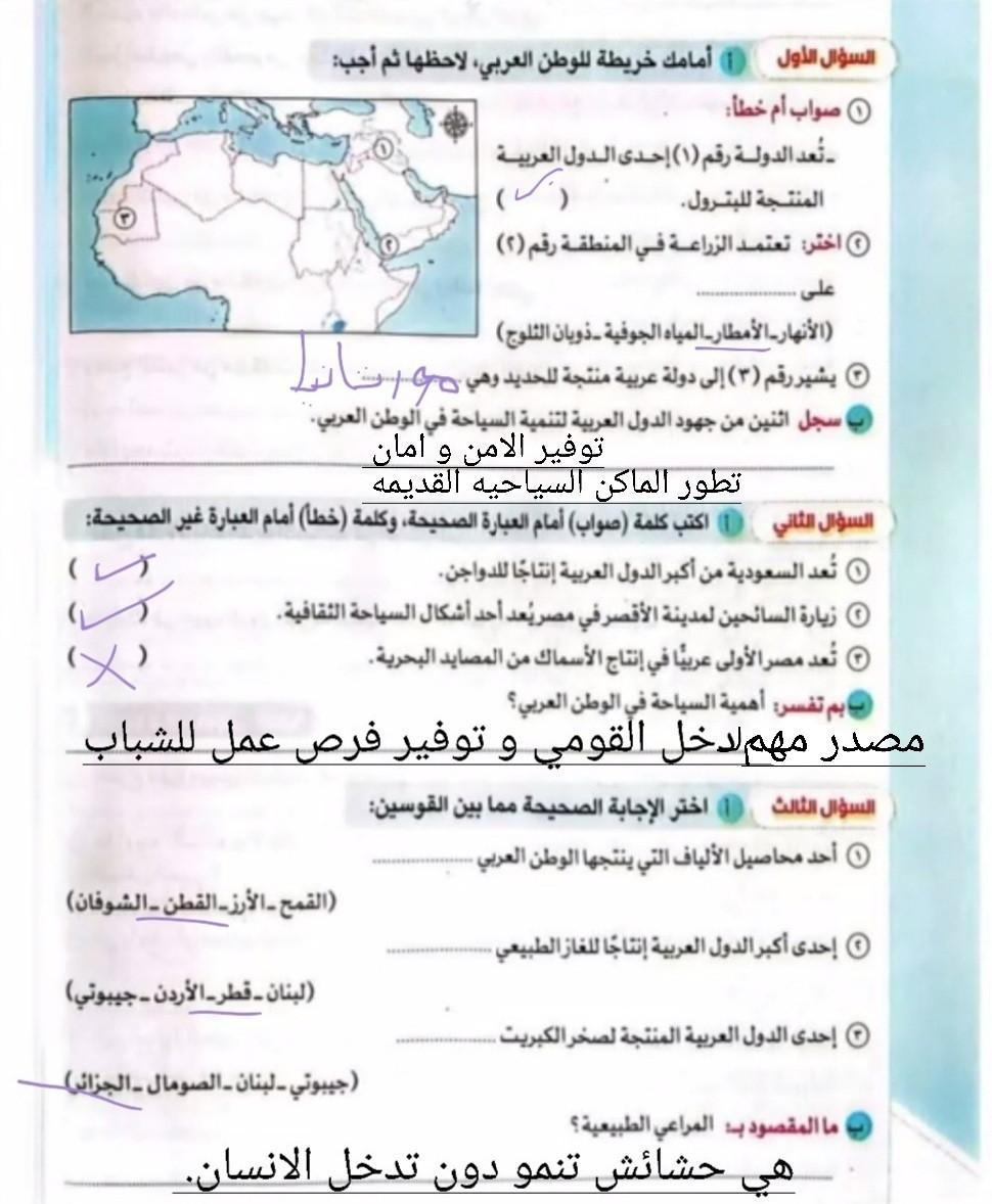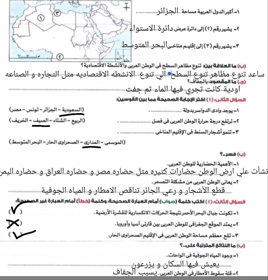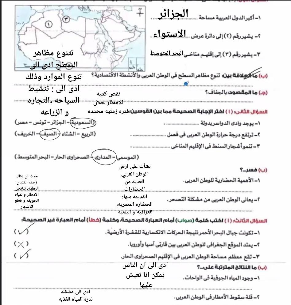 اخدنا اليوم الاهميه الاستراتيجيه والاقتصاديه للوطن العربي وحلينا تدريبات الكتاب المدرسي والواجب تدريبات سلاح التلميذ ص 20 و21 و22